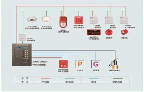 消防報警系統(tǒng)將報警、故障及噴氣信號分別引至消防控制中心。