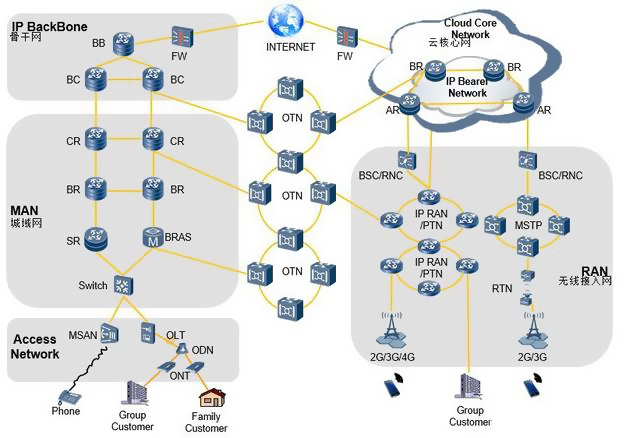 移動通信網(wǎng)絡從整體來看,包括接入網(wǎng)、承載網(wǎng)和核心網(wǎng)三個部分。