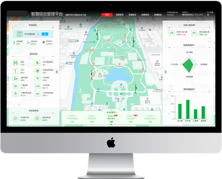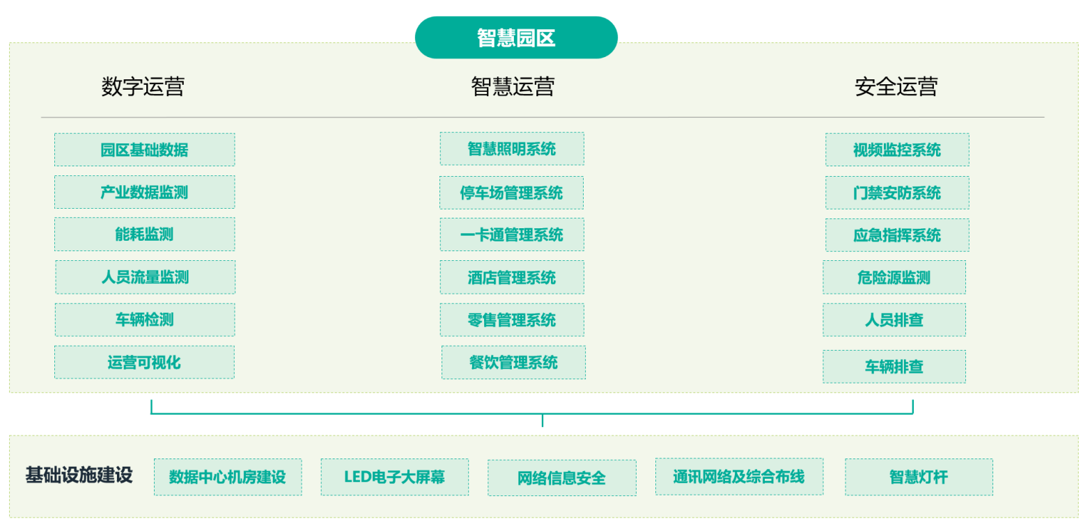 包含綜合管理平臺、園區(qū)可視化運營、指揮中心、LED電子大屏幕、智能商用顯示系統(tǒng)、會議系統(tǒng)、智慧照明系統(tǒng)、餐飲酒店管理系統(tǒng)、一卡通管理系統(tǒng)、零售管理系統(tǒng)、停車場管理系統(tǒng)等多個模塊。